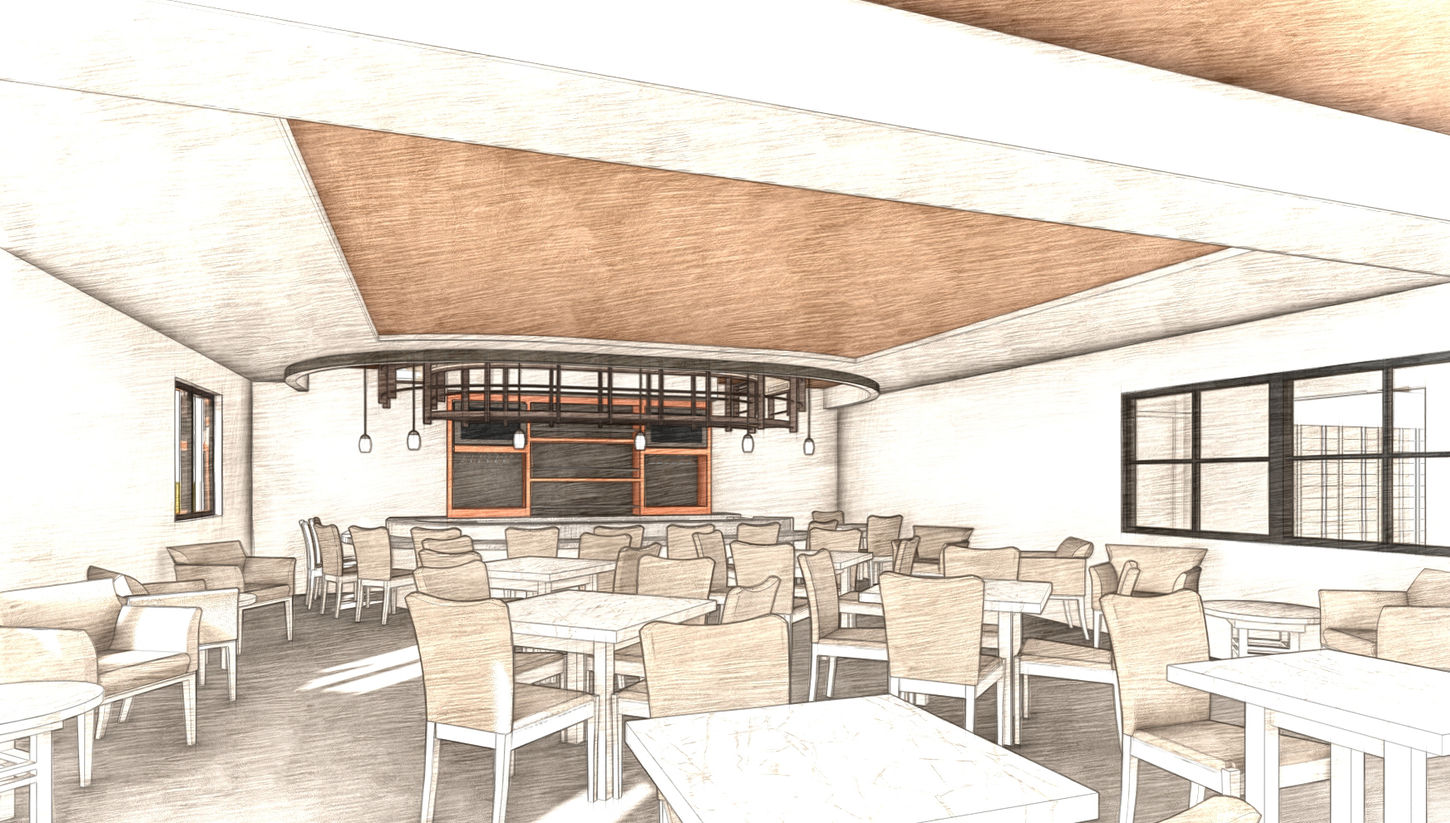 SCA was engaged by HumanGood to develop a proposal for renovations to the kitchen and dining areas of at The Mansion at Rosemont. The existing dining facilities are highly regarded by its residents, but falls short in terms of space for accessibility, variety in dining venues, and areas for community gathering. The kitchen, while operating sufficiently, has opportunities for improvement in the layout of its cooking line and efficiencies of spatial flow. The new proposal includes a reconfigured dining space that utilizes an outdoor patio and is laid out to allow for the comfortable movement of residents using wheelchairs and walkers, as well as storage spaces to facilitate a valet-style service for these items. The proposal also introduces a fast-casual bistro, bar, and "grab 'n go" market, including seating areas that are open outside of dining hours for community gathering. Additionally, the kitchen has been reconfigured to maximize space and facilitate efficient workflows.